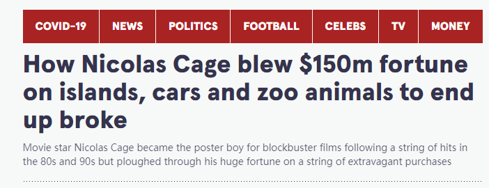 尼古拉斯·凯奇从1983年开始演艺生涯以来一直在影片中饰演主要角色,成功让他积累了不小的财富,一度成为好莱坞收入最高的演员,身家高达1.5亿美元。
