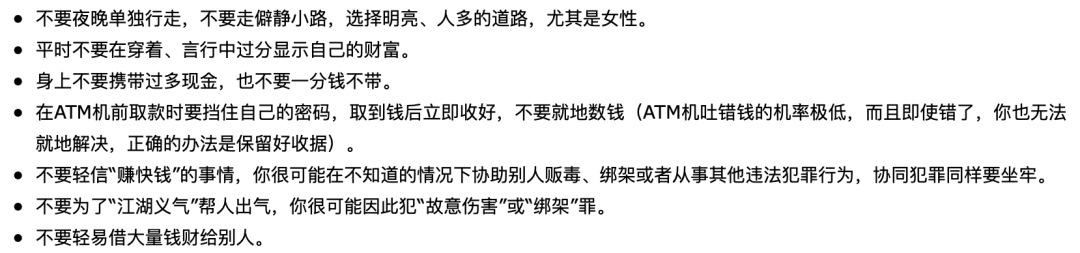 总结下来就是尽量不要夜晚单独行动、不要过多露富、不要轻信“赚快钱”等。