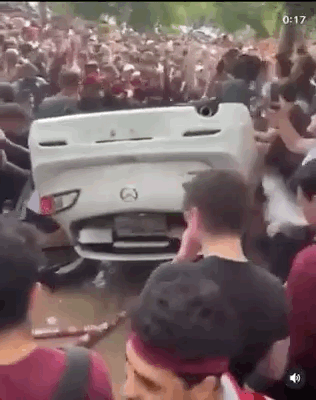 推翻汽车后,四周学生开始欢呼助兴,有人更加跳上翻转的汽车上跳,将现场气氛推至高潮。