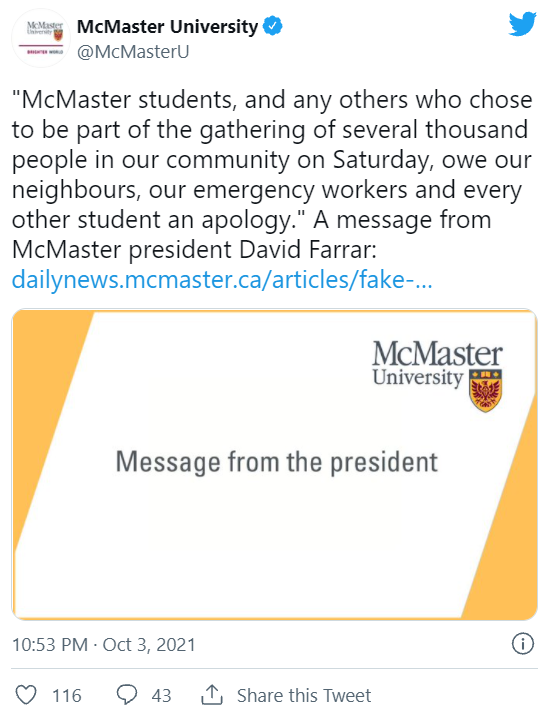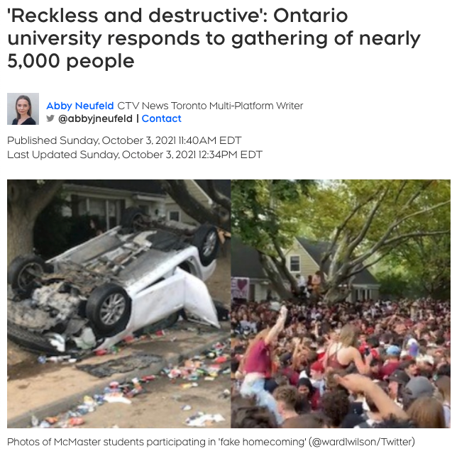 Farrar强调,麦克马斯特大学本来就决定今年不举办任何官方的返校活动,也有很多学生表示不会参加返校聚会,但还是有很多人把他们的话当作耳边风,甚至做出扰乱社会治安的行为。