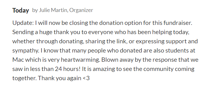 我知道很多捐款的人也是Mac的学生,这让我们很感动。 在不到24小时内,我们看到了那么多捐款,这着实让我们震惊!