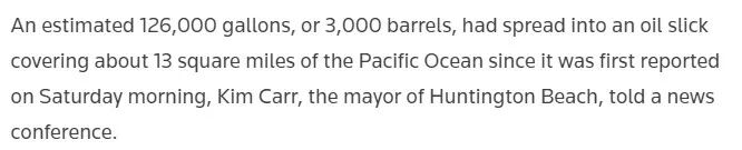 10月2日,美国西海岸的海洋深处发生了大规模的石油泄漏,大量原油的外泄导致至少126,000 加仑原油(47万升,相当于3000桶生产后的原油)泄漏到加州沿海水域,形成了一个占地约 8,320 英亩的浮油区域——比圣莫尼卡的面积还要大!