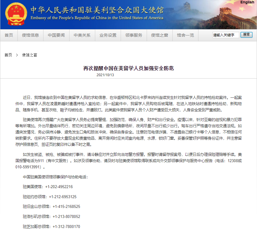 中国驻美机构再次提醒在美中国留学生加强安全防范疫情以来,针对亚裔的歧视和暴力犯罪等有所增加。中国驻美国大使馆于10月13日(周三)发布通知,再次提醒在美国留学的人员加强安全防范,因为最近接连有中国留学生遭到抢劫,其中一人在凌晨遭遇入室抢劫,另有人被尾随后在地铁站遭遇抢劫并被殴打。