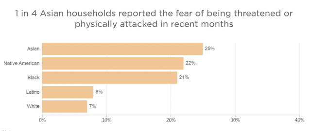 美西时间10月13日,据NPR报道,一项最新民调显示,1/4的亚裔美国成年人表示,在过去的几个月里,他们担心有人会因为他们的种族/民族而威胁或攻击他们或他们的家人。美国原住民害怕威胁和袭击的比例为22%,黑人为21%,白人为7%。
