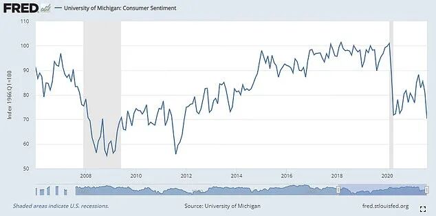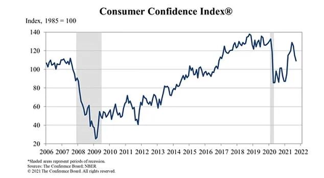 “过去六个月消费者预期明显下降,根据我们关于下降 10 点的经验法则,这表明美国经济现在已经开始进入衰退期了(2021 年秋季)