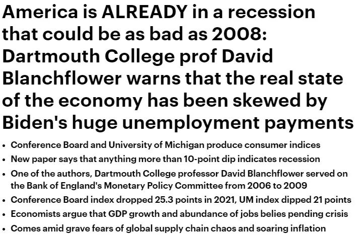 近日,根据前英格兰银行成员布兰奇弗劳尔(David Blanchflower) 的最新研究称,如果以消费者数据为指标,美国经济可能会在未来6个月内持续下滑,其严重程度甚至可以与2008年的金融危机相较。