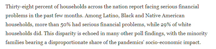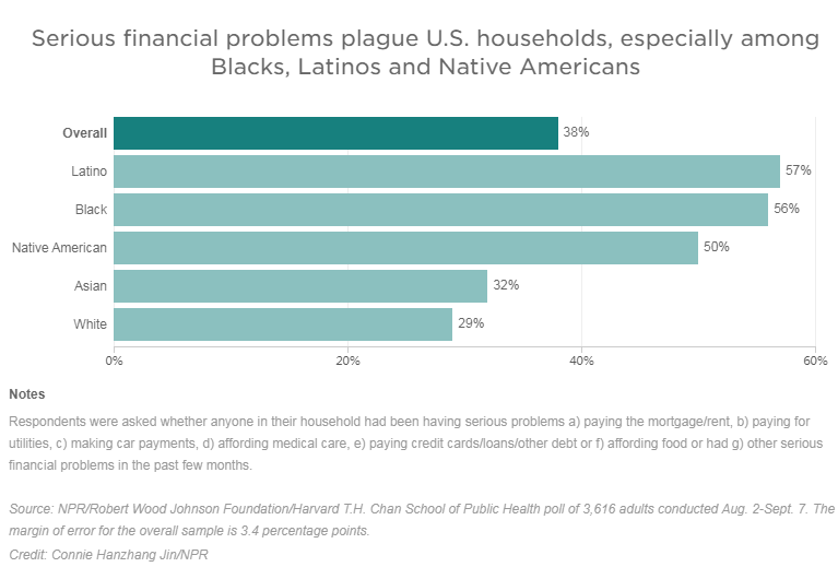 超过50%的拉丁裔、非裔和美洲原住民家庭,以及29%的白人家庭都在遭受“经济危机”:包括无法承担基本生活费,房租、水电bill、医药费都通通没有着落。