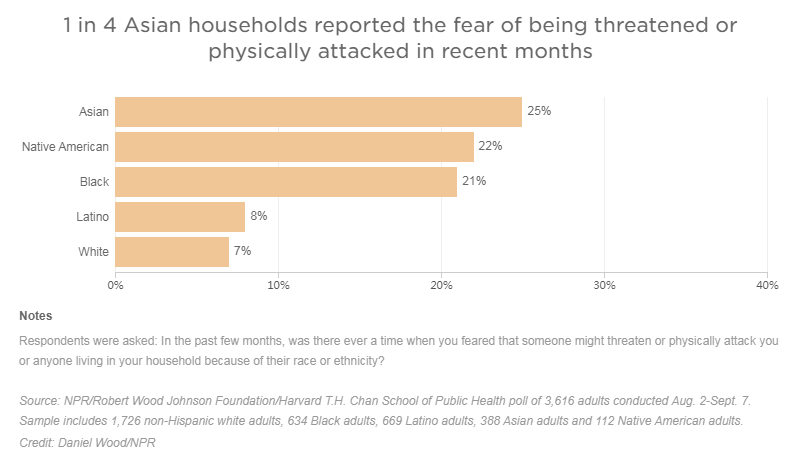 民调显示,有1/4的亚裔美国人承认,在疫情大流行期间,他们总是担心有人会因为种族而攻击自己或者家人。有同样担心的还有22%的美洲原住民,和21%的非裔家庭。