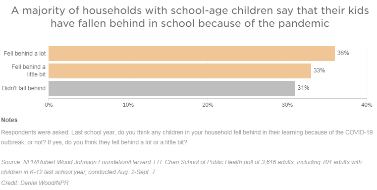 即便现在新学年已经开始,仍有70%的家长认为,疫情期间落下的学业很难能够弥补上。