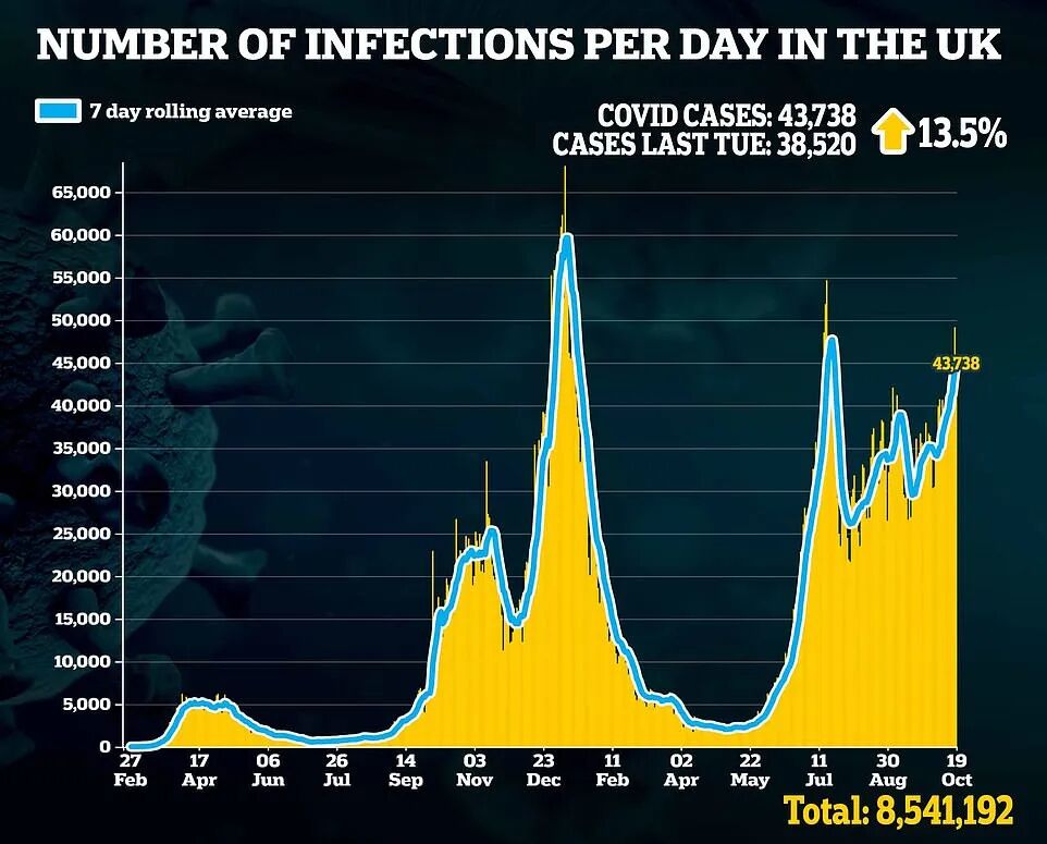 据报道,英国日前每日新冠死亡人数达到223人,创7个月新高;1周病例增加了13%,日增超过4万例,17日当天日增更是超过4.5万例,创解封以来的单日确诊最高纪录。
