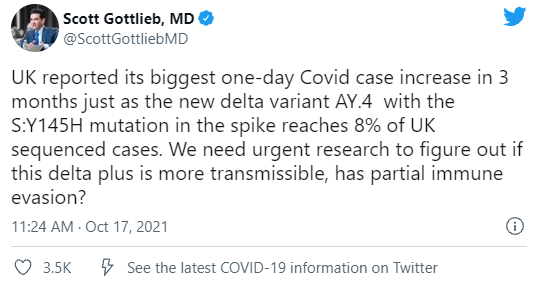 这一“变种新情况”立即引发了前美国FDA局长、现辉瑞董事成员Scott Gottlieb的关注。