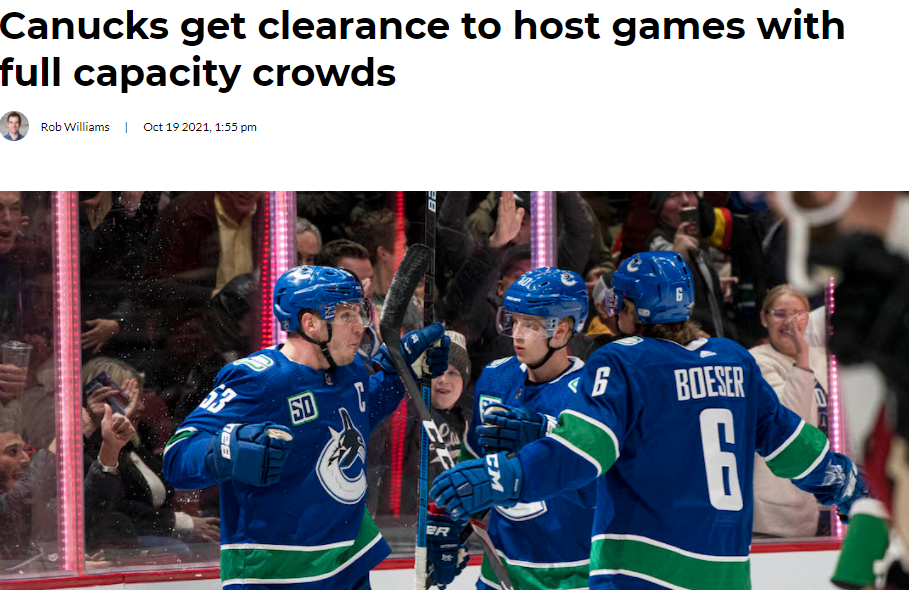 室内集会限制取消,赛事、婚礼等活动允许100%开放,包括26日即将在BC体育馆展开的加人队Canucks比赛,也获得了满场观赛的许可。