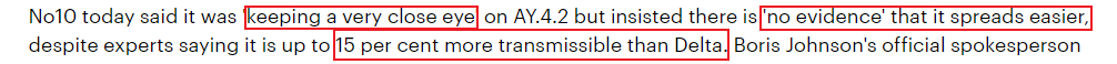 然而,已经冒出了1.4万例Delta+的英国,依然在“嘴硬”——首相鲍里斯办公室表示,他们正在“密切关注AY.4.2”,但坚称“没有证据显示它更容易传播”,尽管专家们早已指出,Delta+的传播率被Delta要高出15%。