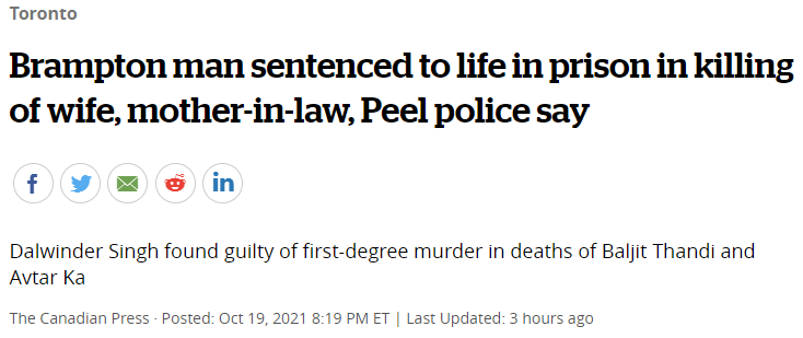 近日,加拿大安省宾顿市一名男子因捅死妻子和岳母被控一级谋杀罪,两个无期徒刑同时执行,25年内不得假释!