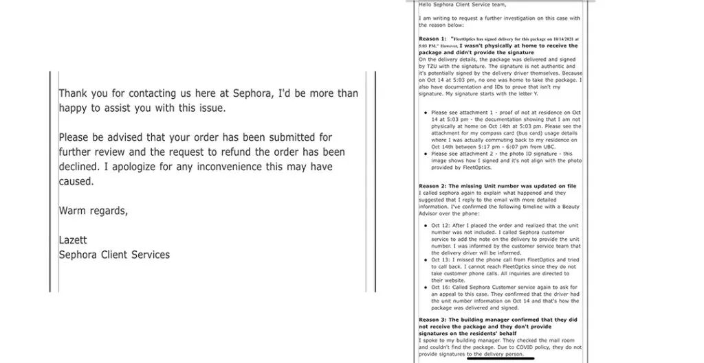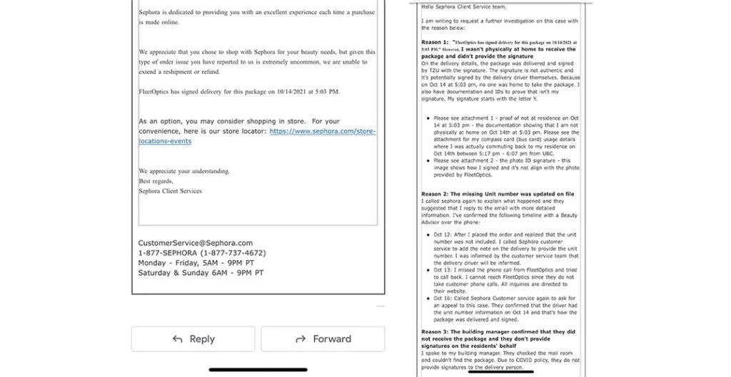 她联系了丝芙兰,向他们展示了她的身份证照片,以证明包裹的签名是不同的。她还表明物品送达时她正在公共汽车上。