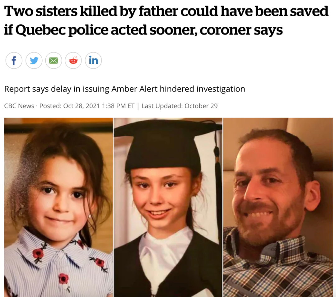 加拿大CBC于10月30日刊登的报道显示,一旦安珀警报能在更早时间发出,两个无辜的女儿或能得救,那名狠心的父亲也不会吊死在树上……