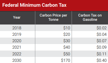据估算,目前的碳价格是每吨35元。加拿大设定了从2023年到2030年的全国碳污染最低价格。碳价格将从2023年的每吨65元上升到2030年的每吨170元。根据加拿大税务局的数据,碳价格的增加意味着汽油价格上涨,到2030年将导致汽油价格每升上涨近40分。