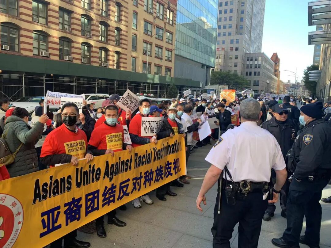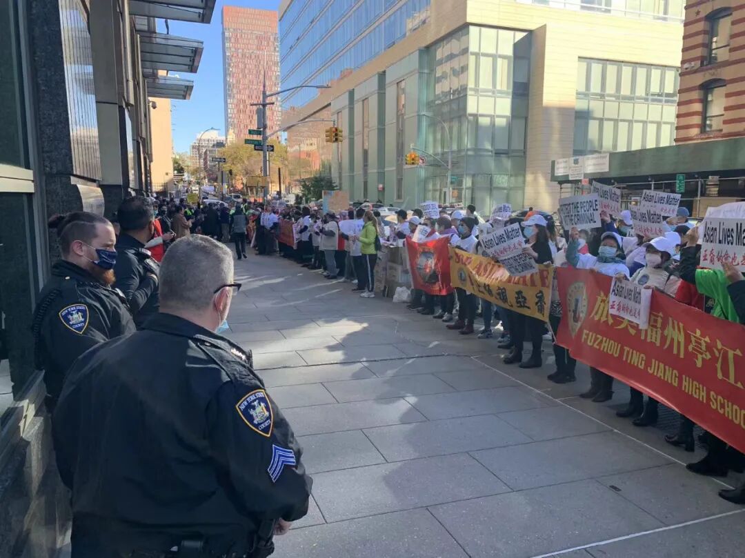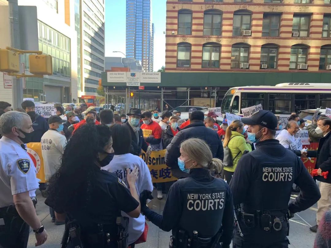 在布鲁克林的金斯郡高级法院门口,近千人一起高喊着“亚裔的命也是命”,抗议种族歧视与不公。