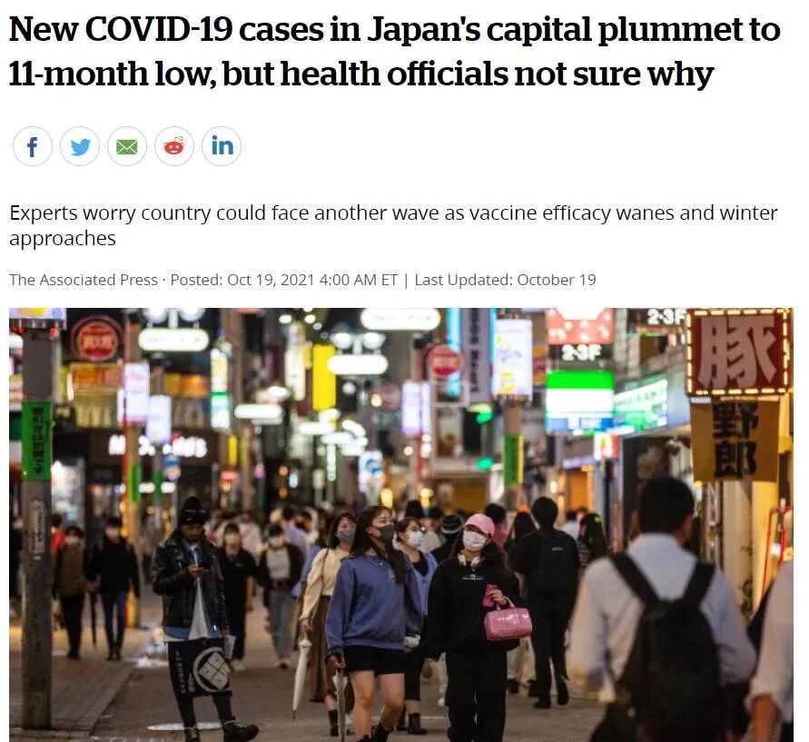 10月中下旬,CBC也报道:东京新冠感染突然大幅下降,原因专家也不清楚。