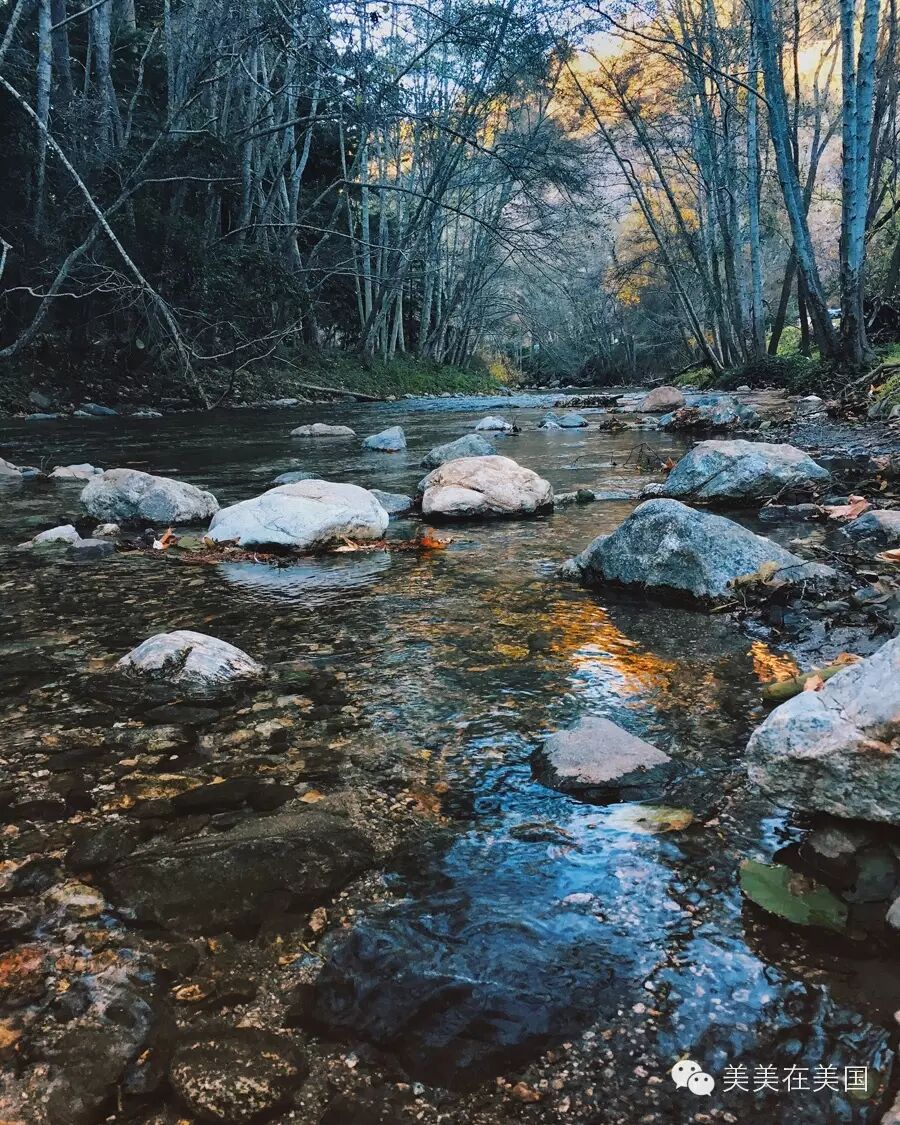 继续往前开,不记得怎么就进了个山谷,有个旅馆叫River Inn,后院就是山中溪流,气温立刻降了下来,但阳光照在山顶上,又倒映在水里,闪闪发光。
