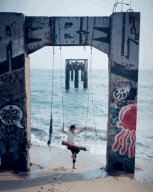上秋千也是有难度的,这个秋千还是蛮高的,靠手撑上去估计有点难,只能靠我的大长腿了,还有个难点是浪潮有时候大到可以把人淹没,好几个人都被弄得湿身了。