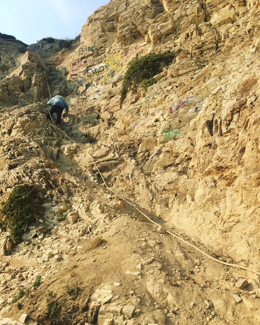 必须靠一条绳索拉着才能下得去……我在悬崖上徘徊了好一会儿,仔细观察别人是怎么下去的,发现应该可以完成的,只是必须小心前进。