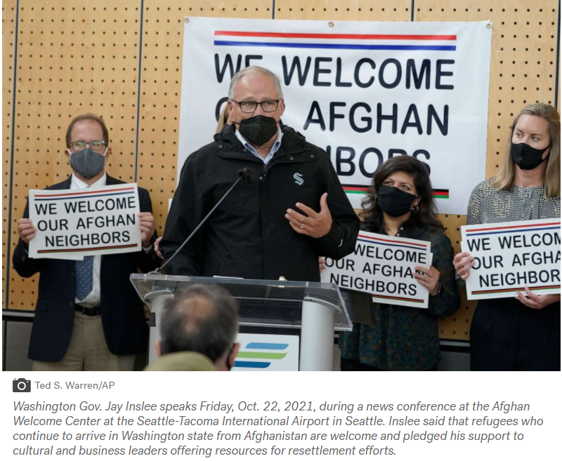 华盛顿州州长杰伊·英斯利于 2021 年 10 月 22 日星期五在西雅图西雅图-塔科马国际机场的阿富汗欢迎中心举行的新闻发布会上发表讲话说,我们继续欢迎阿富汗难民,并承诺在在文化和商业支持方面为安置工作提供资源。