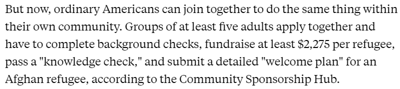 现在,普通美国人可以联合起来在他们自己的社区内做同样的事情。但必须具备以下条件:至少包含五个成年人组成的资助团体才可以一起申请,必须完成背景调查,通过“知识审核”,可以为每位难民筹集至少2,275 美元,并且需要为阿富汗难民提交详细的“欢迎计划”。
