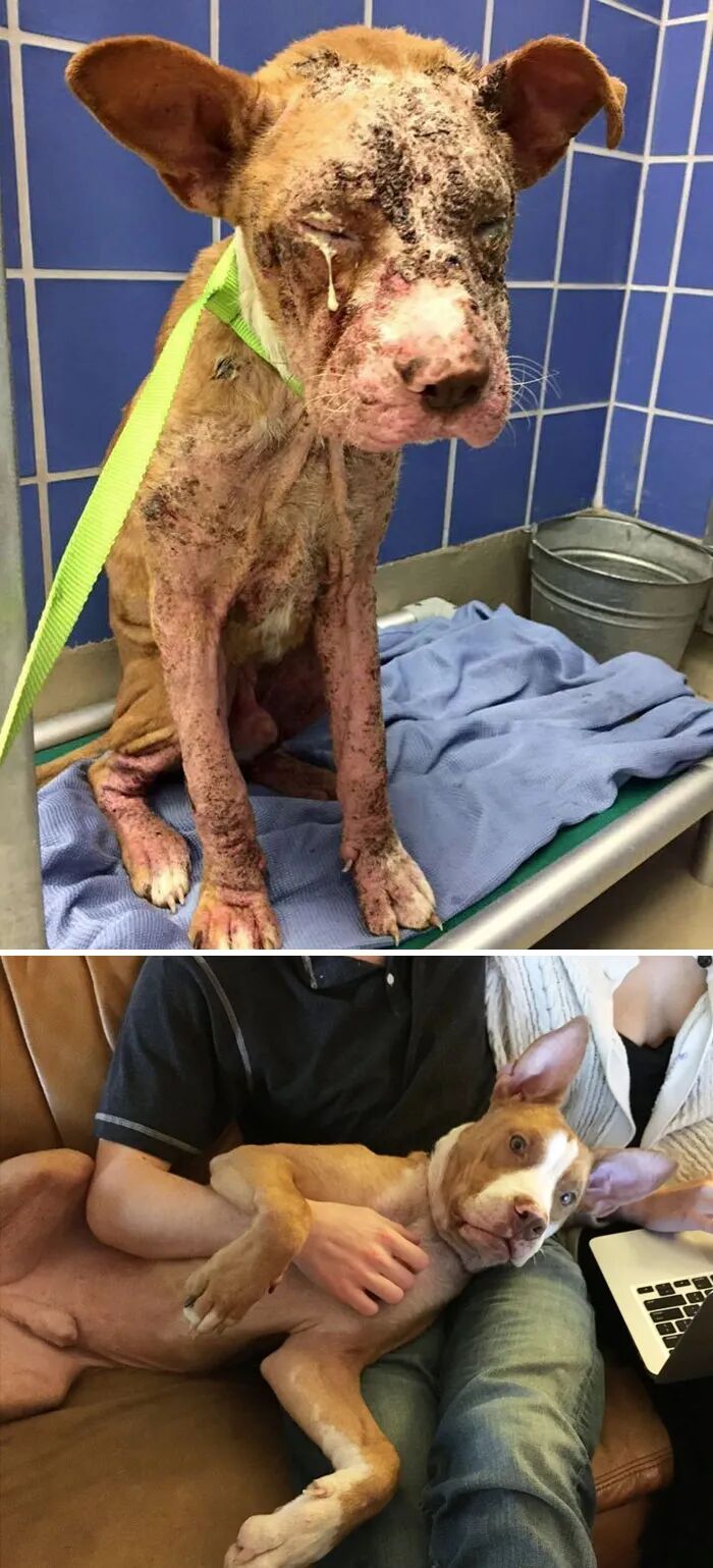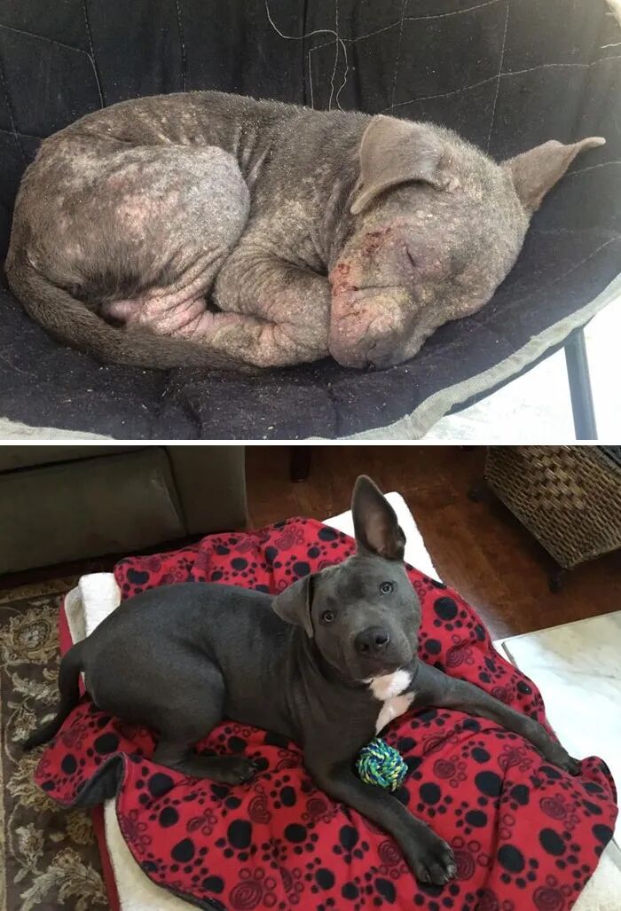 绑在店外被遗弃,患有严重疥癣、眼部感染,几乎认不出是只比特犬,被收养后体验到了家庭的温暖,完全没留下之前任何疾病的痕迹。