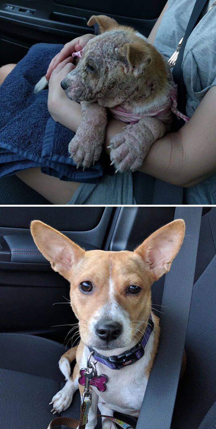 感染寄生虫,又骨瘦如柴,流浪在街上,遇到善良的陌生人,好说歹说终于放下戒备上了车,最终重又长出了美丽的毛发。
