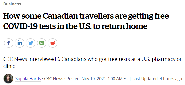 CBC News采访了最近前往美国的6名加拿大。他们在返回加拿大之前,在美国的药房或诊所都接受了免费的COVID-19核酸检测。