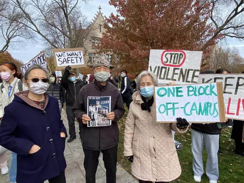 由约60位中国学生自主发起的这场集会游行在芝大校园Main Quad举行的集会响应热烈,自发到场的各族裔学生、教职员从11时许持续涌入,现场不少同学举着“AM I NEXT?”(我会不会是下一个?)、WE WANT SAFETY(我们要安全)等的牌子……迫切希望校方及有关单位即时改善校园安全的心声。
