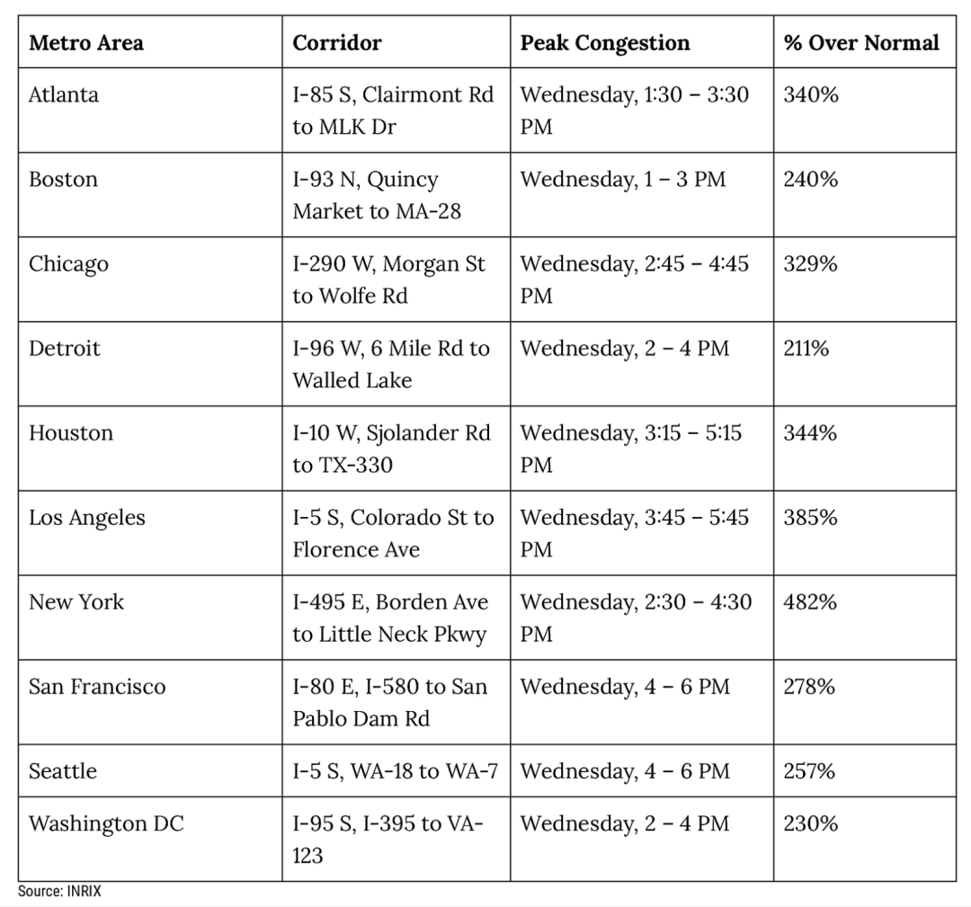 根据 INRIX 的数据,预计这 10 条高速公路将出现糟糕的塞车情况和行驶时间: 根据 INRIX 的数据,一般来说,周三旅行最差时间是从中午到晚上 8 点,而出门的最佳时间是晚上 9 点后。 AAA 表示,在这些时候,驾驶人应该期待更长的交通时间,并计划提前上路。总体而言,预计在这个长周末将有 5,340 万人出门旅行,包括:汽车、飞机、火车或其他形式的交通工具。