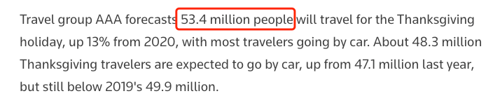 根据美国汽车协会 (AAA) 的预测,今年感恩节会有5340万人出行,比 2020 年增长 13%,其中大多数旅客开车出行。