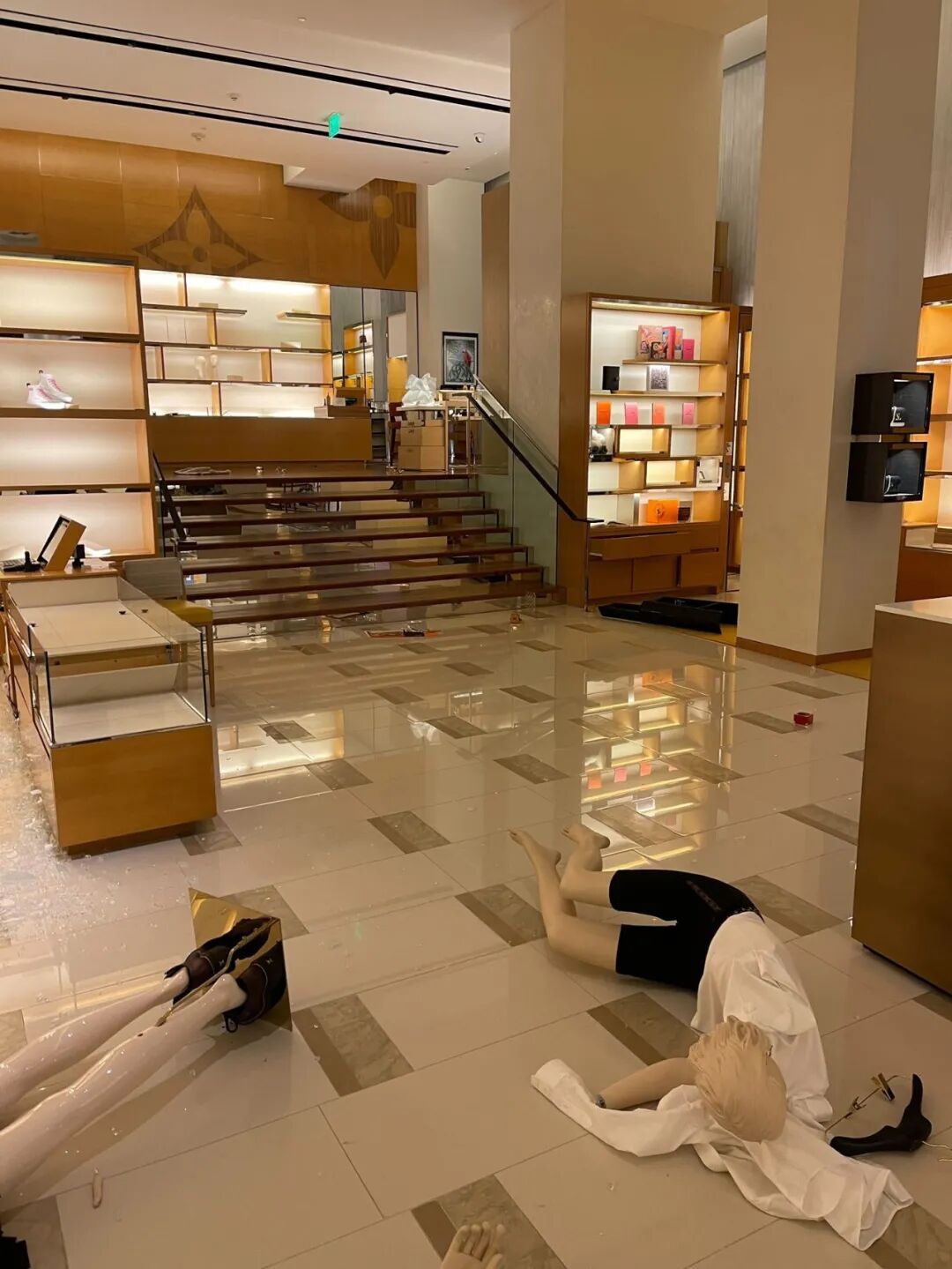 据称,当晚总共有6名嫌疑人被捕,LV商店内货架上的商品几乎被洗劫一空,门窗也被打碎。