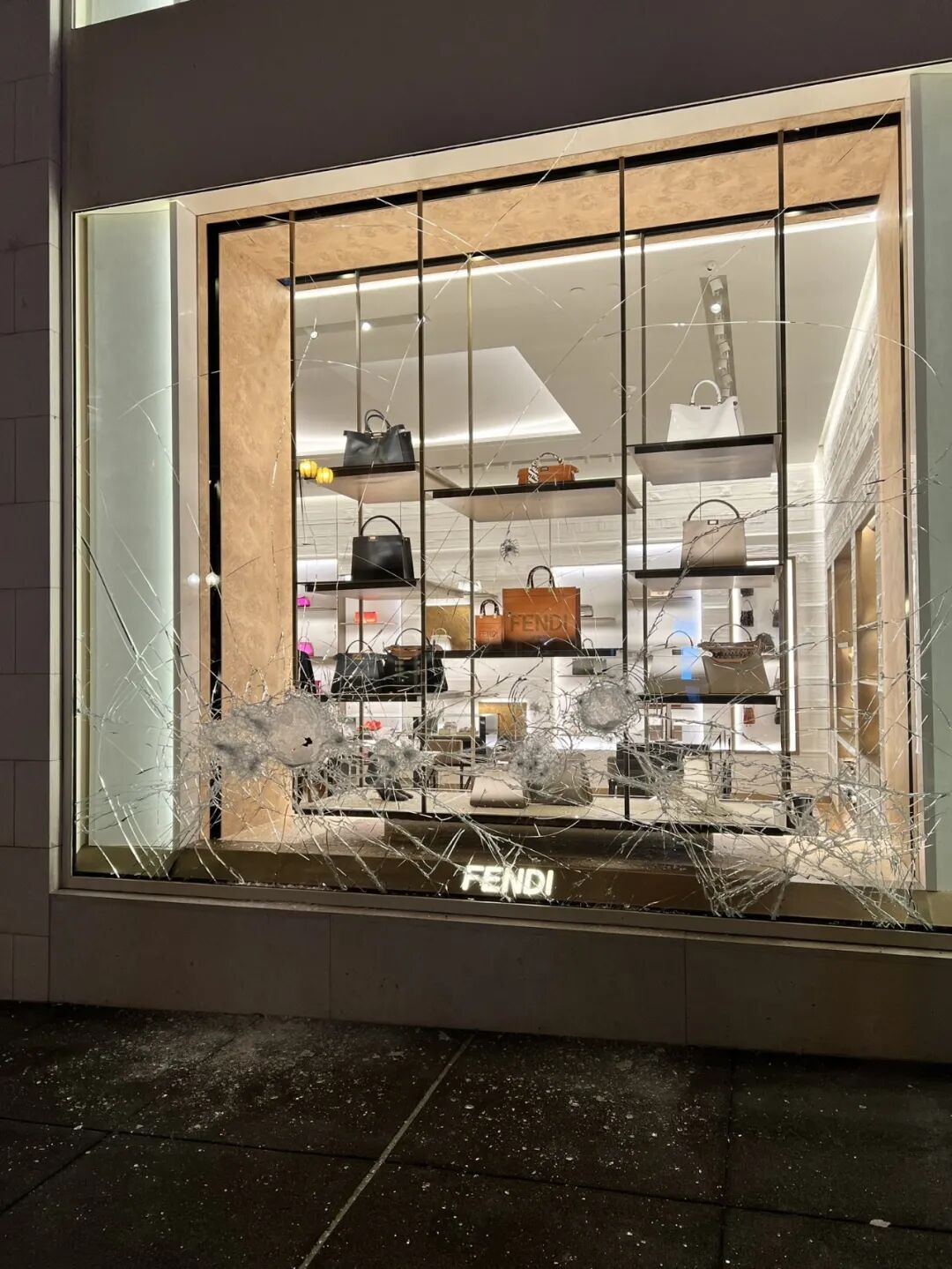 洛杉矶比佛利山庄Rodeo 大道上的LV店和 Saks Fifth Avenue店面窗户被砸。