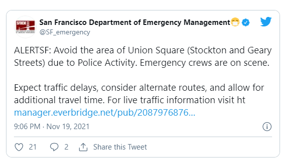 推特用户@Yealenne在晚上 8 点 25 分发布了一段关于商店橱窗破碎的视频并评论说:“旧金山联合广场的路易威登刚刚被洗劫一空。”