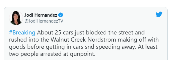 网友Jodi Hernandez说:“大约有25辆汽车堵塞了街道,冲进核桃溪的Nordstrom,偷走了货物,然后上了车疾驰而去。至少两人在警察枪口威胁下被捕。”