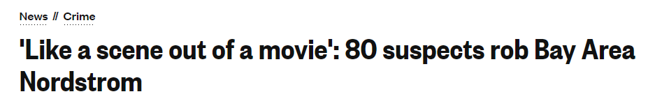 11月20日晚上,SFGATE媒体表示80多人冲进东湾核桃溪的Nordstrom,抢走货架上的商品,并拿出一袋袋的赃物。abc报道,目击者称大约有100人参与抢劫。