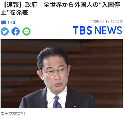 据日本TBS电视台报道,鉴于新冠变异病毒Omicron毒株在世界范围内扩散,日本宣布,针对所有国家,目前原则上停止外国公民入境。