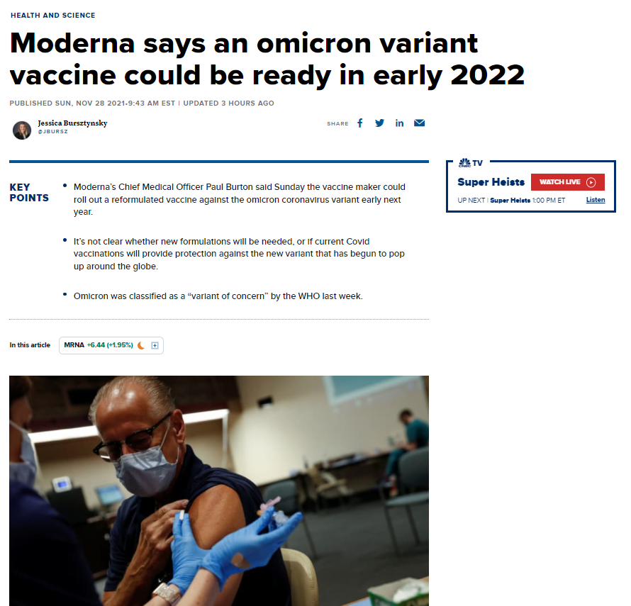 Moderna称2022年初推出针对疫苗据CNBC新闻报道,Moderna首席医疗官保罗·伯顿(Paul Burton)周日表示,可能会在明年年初推出一种针对omicron变种病毒的重新配方疫苗。