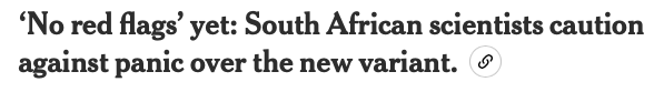 南非卫生官员周一敦促公众不要对Omicron变种的出现感到恐慌。他们说,现在对Omicron的传播率是否更高或会导致更多住院或重病进行评估,还为时过早。 南非知名的流行病学家兼H.I.V. 研究员Salim Abdool Karim说:“我们根本没有关于该病例临床表现的可靠数据。到目前为止,我们还没有发出红色警告。”