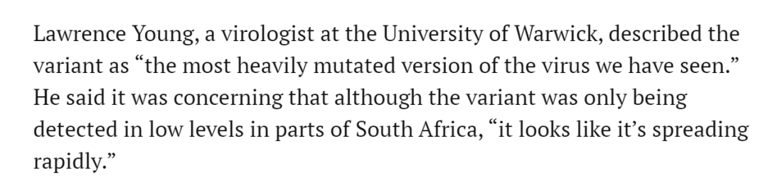 首先因为该病毒变异程度极大,可能导致原先感染/接种产生抗体无效、传播力、感染力增强:该变异株关键结构S蛋白上共出现了32个氨基酸位点变异,而delta株仅约10个位点变异。