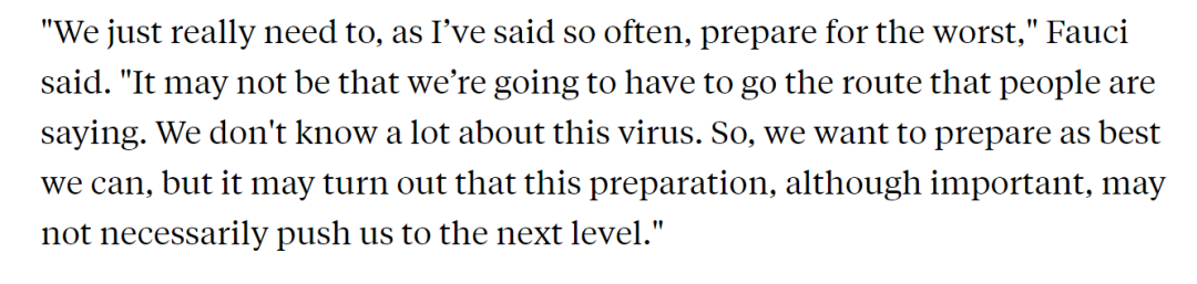 “我们都知道,当病毒已经传播到多个国家时,它到这(美国)不可避免,问题是我们做好准备了吗?”