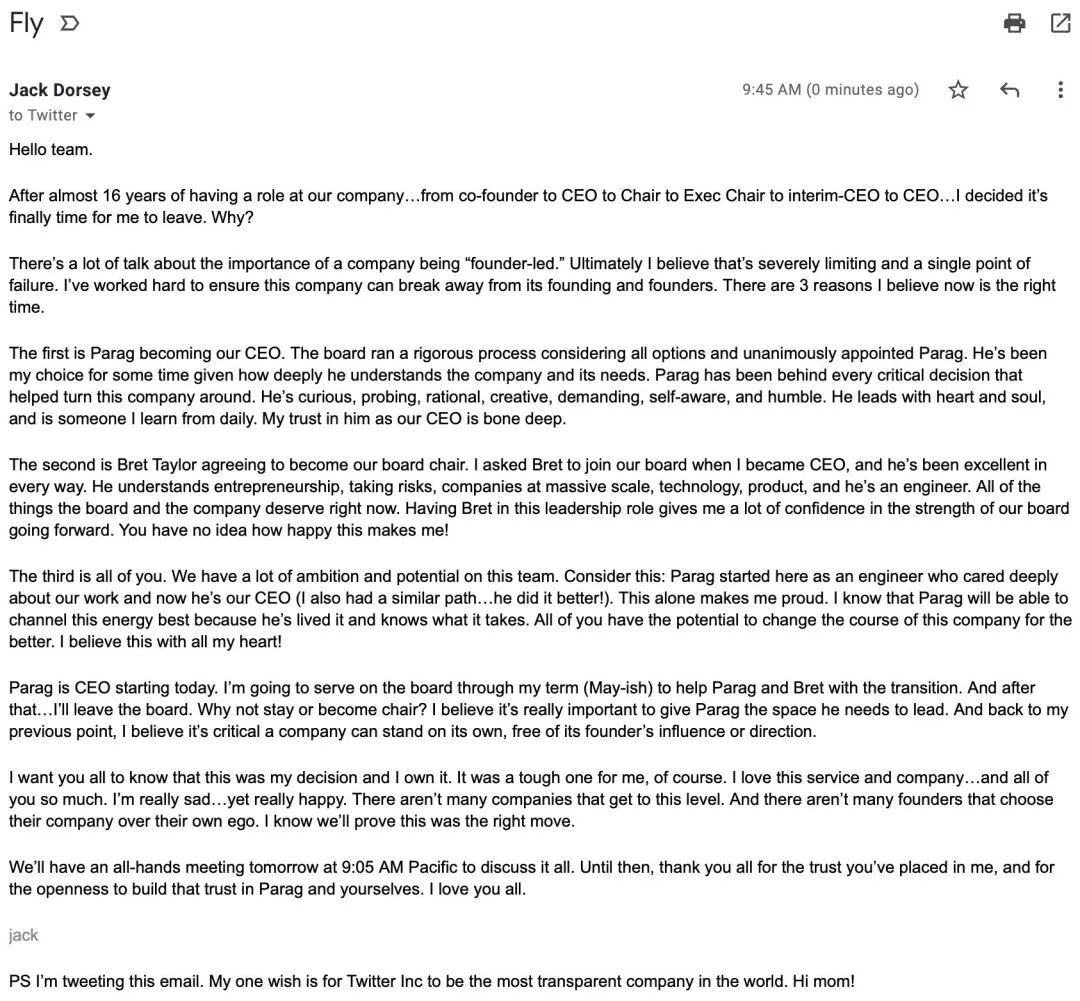 “我决定离开推特,是因为我相信,公司已经准备好离开创始人。”