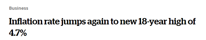 除此之外,加币下跌的另外一个原因和加拿大突破性的通货膨胀和消费指数上涨也脱不了关系。根据CBC News的报道,加拿大10月的通胀率跃升至4.7%,创18年里历史新高。其中,交通,住房和食品价格的上涨对生活成本的上涨贡献最大。