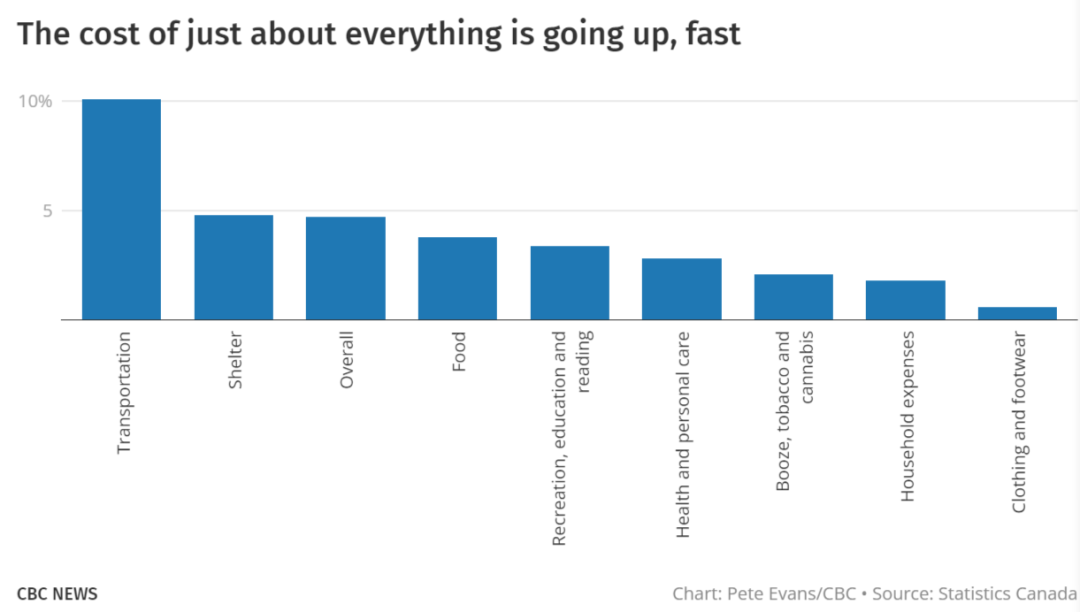 加拿大全国的食物价格上涨3.9%,其中食用油的价格涨幅最大达到18.5%,肉类价格上涨至9.5%,达到2015年以来肉类价格最快增长速度,尤其是培根的涨幅超过了两倍。除此之外,住房成本上涨4.8%,汽油价格上涨了近33%。总体而言,加拿大几乎所有东西的成本都在快速上涨。