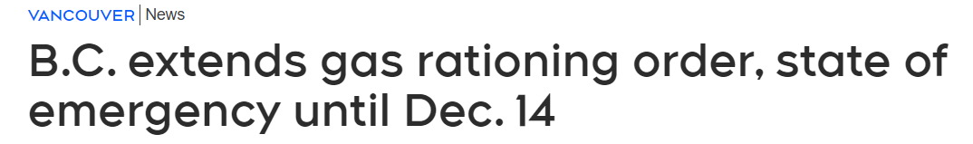 一系列强烈风暴的持续到来对BC省南海岸的洪涝影响加剧,这也促使政府将汽油配给令和紧急状态再延长两周直到12月14日。