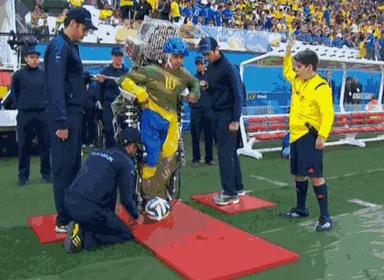 在2014年巴西世界杯开幕式,瘫痪的青年利亚诺·平托就是穿了这样庞大、笨重的外骨骼,通过脑机接口踢出了当年世界杯的第一球。