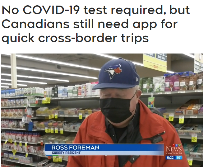 不少已经完全接种新冠疫苗的省民按照规定赴美加油和购买生活必需品,回来时发现确实是不用出示检测报告了,但要出示ArriveCAN应用程序!